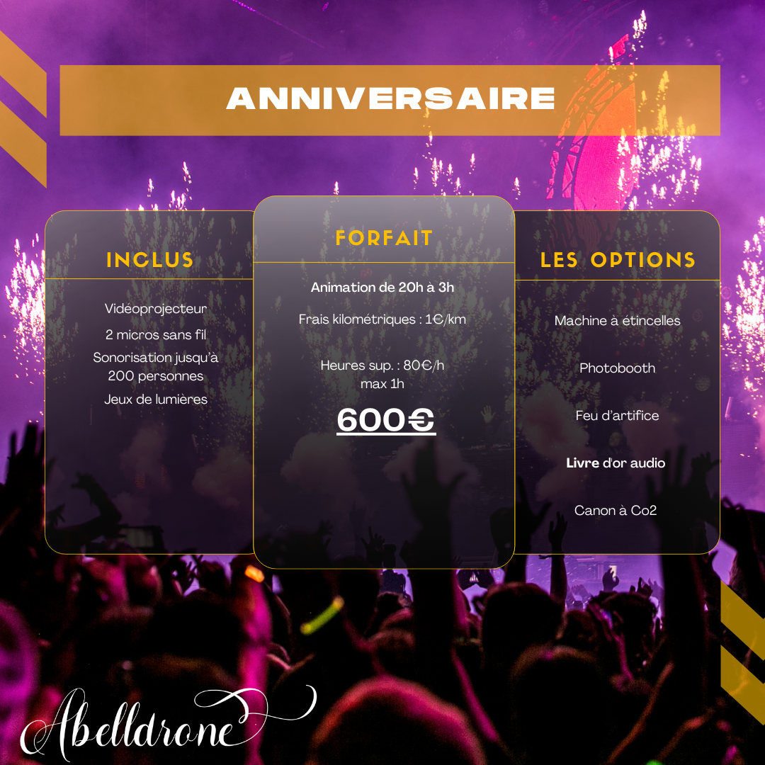 Dimitri, gérant de la société Abelldrone est heureux d’animer et de mixer votre soirée de mariage, d’anniversaire ou tout autre événement. Ce professionnel est avant tout un passionné, et cela se ressentira dans son travail : vous allez passer un moment unique, placé sous le signe de la bonne humeur et de la convivialité. L'idéal pour rendre votre union encore plus mémorable...